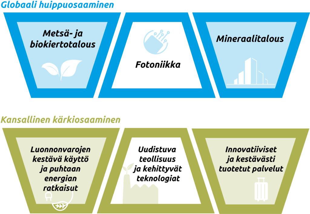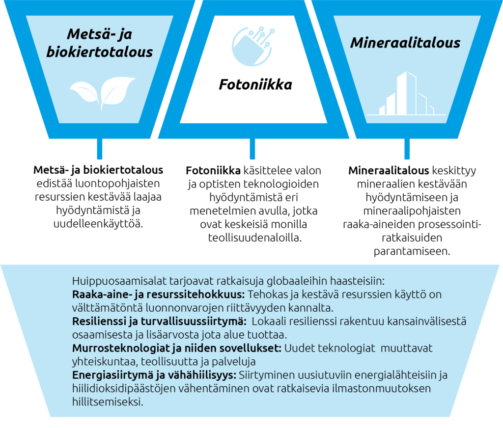 Pohjois‑Karjala asemoituu eurooppalaisessa ja kansainvälisessä toimijakentässä erityisesti kolmen globaalin huippuosaamisalan kautta: Metsä- ja biokiertotalous, fotoniikka ja mineraalitalous. Strategisesti tärkeillä aloilla on tällä hetkellä merkittävä rooli TKI-toiminnan lisäarvon synnyttämisessä ja ne omaavat myös tulevaisuustarkastelussa suuren kasvupotentiaalin. Itä-Suomen yliopiston, Karelia ammattikorkeakoulun, GTKn, LUKEn, EFIn ja SYKEn huippuosaamisalat luovat ympärilleen uudenlaisia liiketoiminta- ja arvoverkostoja paitsi omilla aloillaan, myös muiden toimialojen rajapinnoilla. Mineraalitaloudessa, fotoniikassa ja metsä- ja biokiertotaloudessa on mahdollisuuksia luoda markkina- ja kysyntävetoista innovaatiotoimintaa, jolla on myös yhteiskunnallista merkitystä.