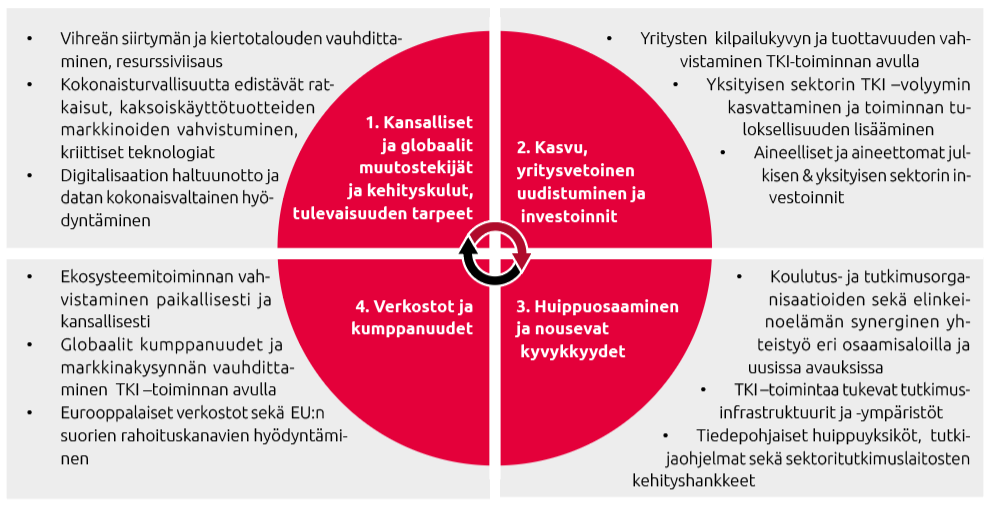 Älykkään erikoistumisen strategian valmisteluun ovat vaikuttaneet mm. talouden haastava suhdannetilanne, globaali geopolittinen epävarmuus, toimintaympäristön muutokset sekä näihin liittyvät vaikeasti ennakoitavat kytkennät. Siksi valmistelutyössä on tunnistettu vaikutuspolkuja, systeemisiä prosesseja sekä niitä tekijöitä, jotka muokkaavat TKI‑toiminnan toimintaympäristöä.